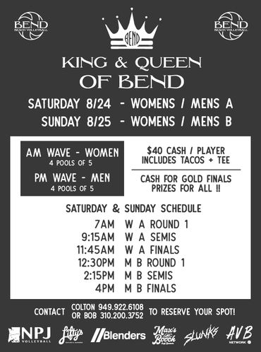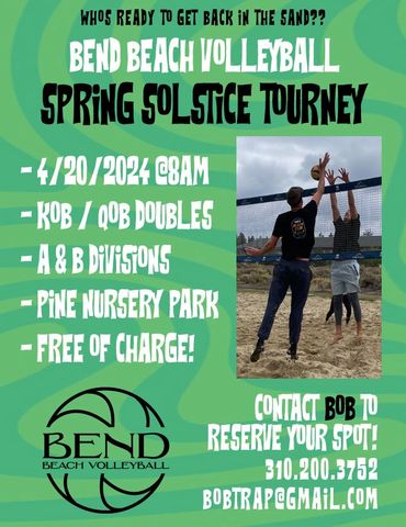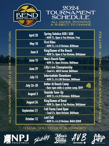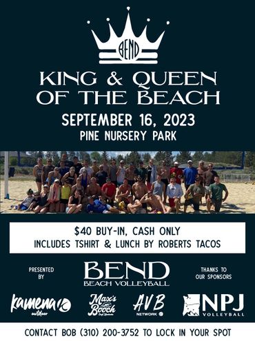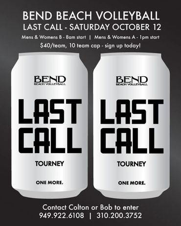 Going on year 3, Bend Beach Volleyball has provided me with a new venture within the volleyball realms - tournament hosting & directing. With a little help from my great friends in the Bend Volleyball community, we run tournaments all summer long. Our tournaments pay out cash and are always a blast whether youre playing on center court or heckling from the best seat in the house!